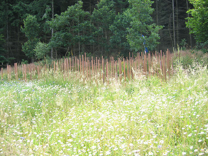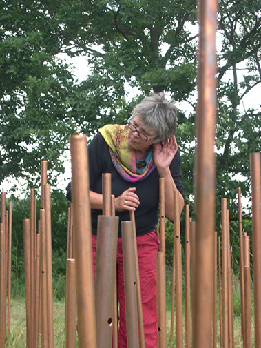 120 Kupferrohre stehen im Feld und 'tönen' im Wind.